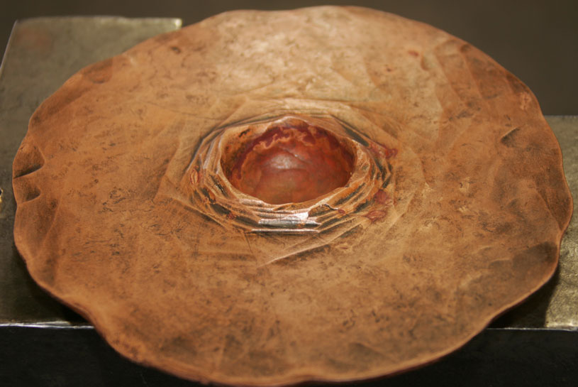 Finished bowl forged from a piece of copper bar, 1 1/2" in diameter, 5 inches long, first squished lengthwise in the big press.