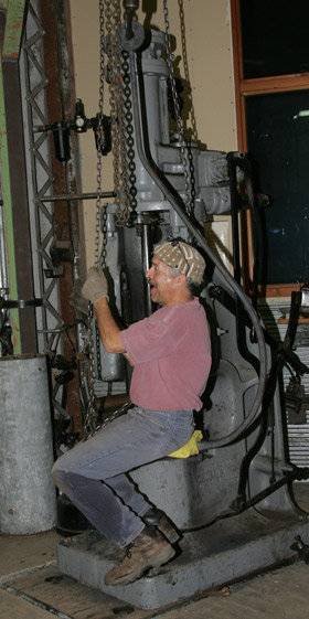 Morris Hallowell (later) using the powerhammer seat. An historic form---it allows enhanced comfort, mobility and precision in long powerhammer sessions.