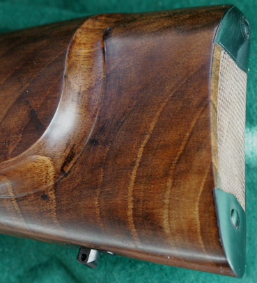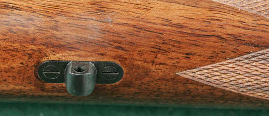 Underside of forend: Inletted swivel stud and borderless checkering. Checkered Butt with Heel & Toe Plates.