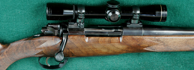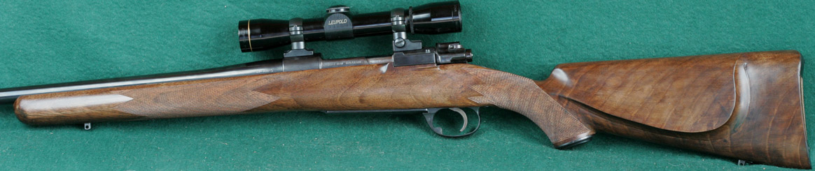 24" round barrel. Figured walnut stock with borderless classic wrap-around point-pattern checkering, beaded cheekpiece, inletted swivel studs, steel-capped pistol grip and checkered wood butt finished with steel heel & toe plates. 14"pull. Yugoslav Model 1924 Mauser 98 action manufactured by FN, with Model 70-type safety, Timney trigger, Blackburn-type hinged floorplate and checkered bolt knob. Leupold M8-4x Compact scope on Leupold mounts. Weight: 8lbs, 14oz. 99%+blue. $2450.