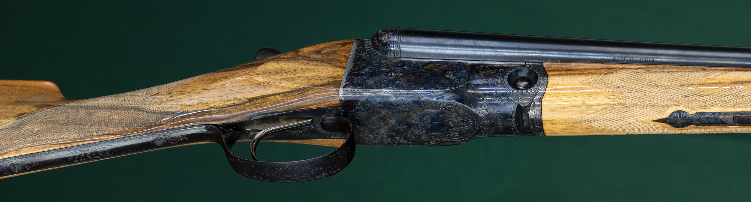 | engraved action with setter on left, pointer on right and flushing pheasants |