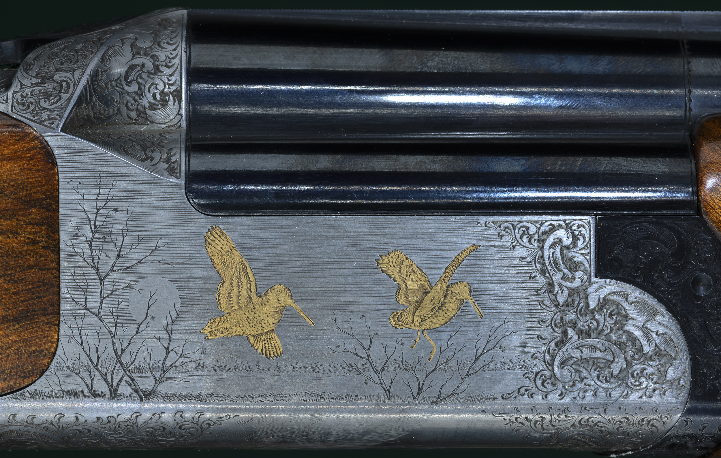 | | inlaid in gold on the left, two woodcock inlaid in gold on the right and a gold |