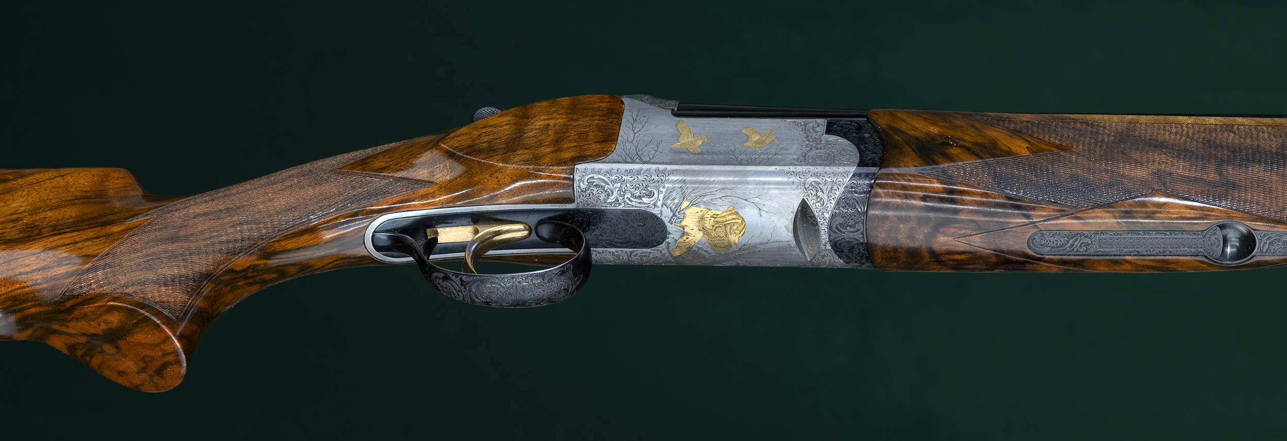 | | checkering, classic comb and pistol grip. Fine scroll and game scene |