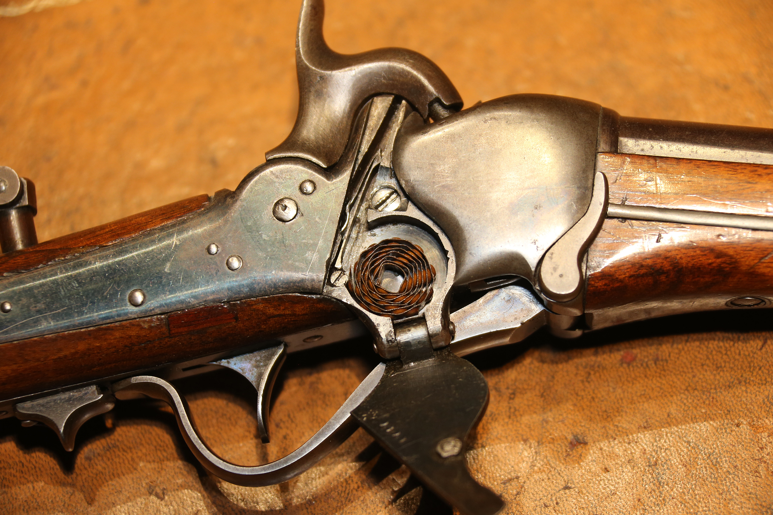 A roll of Maynard Tape Primers n a Sharps Model 1851 Carbine. Designed to speed the loading process a bit.