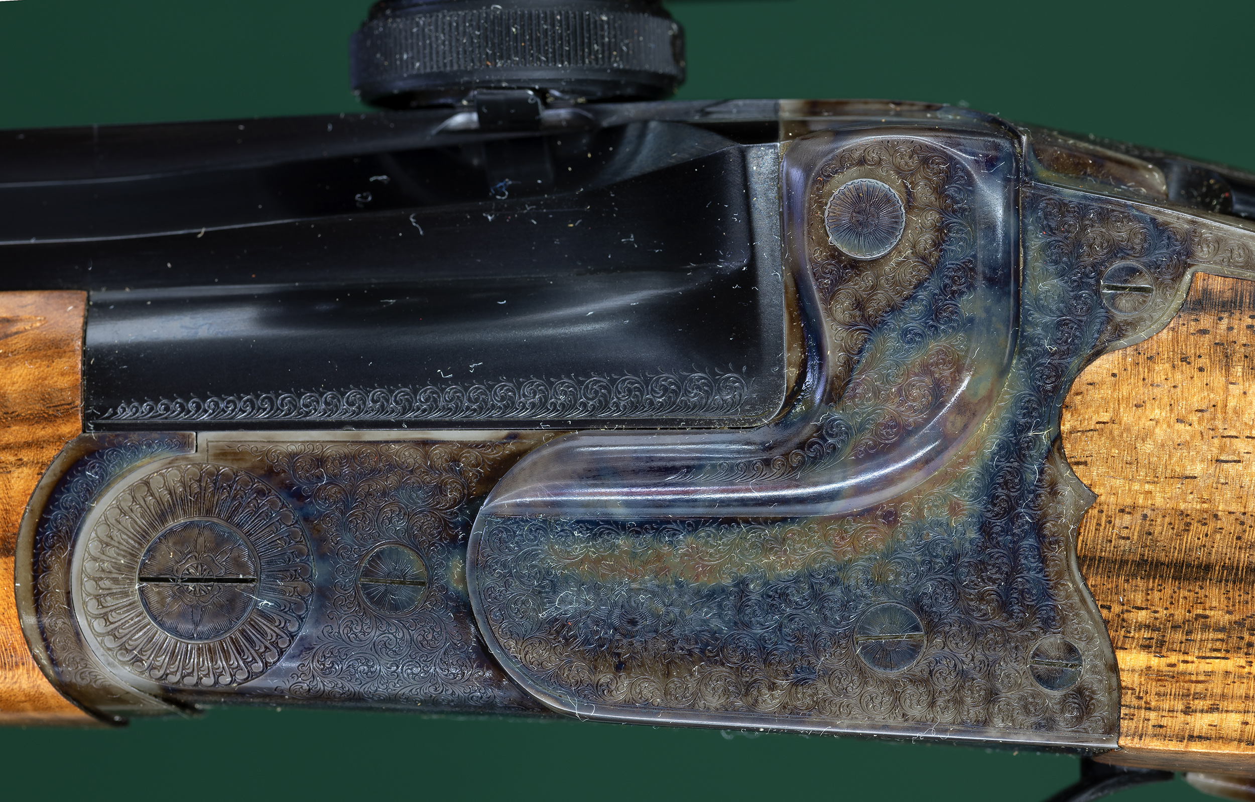| sear, automatic ejector, and manual top tang safety with SAFE inlaid in gold. |