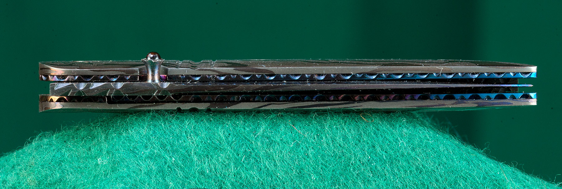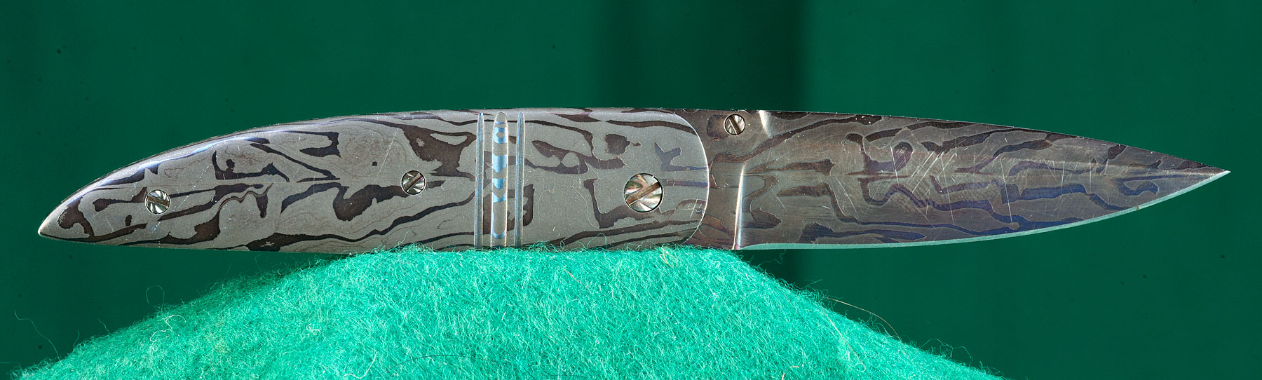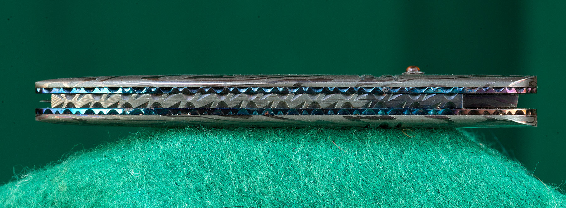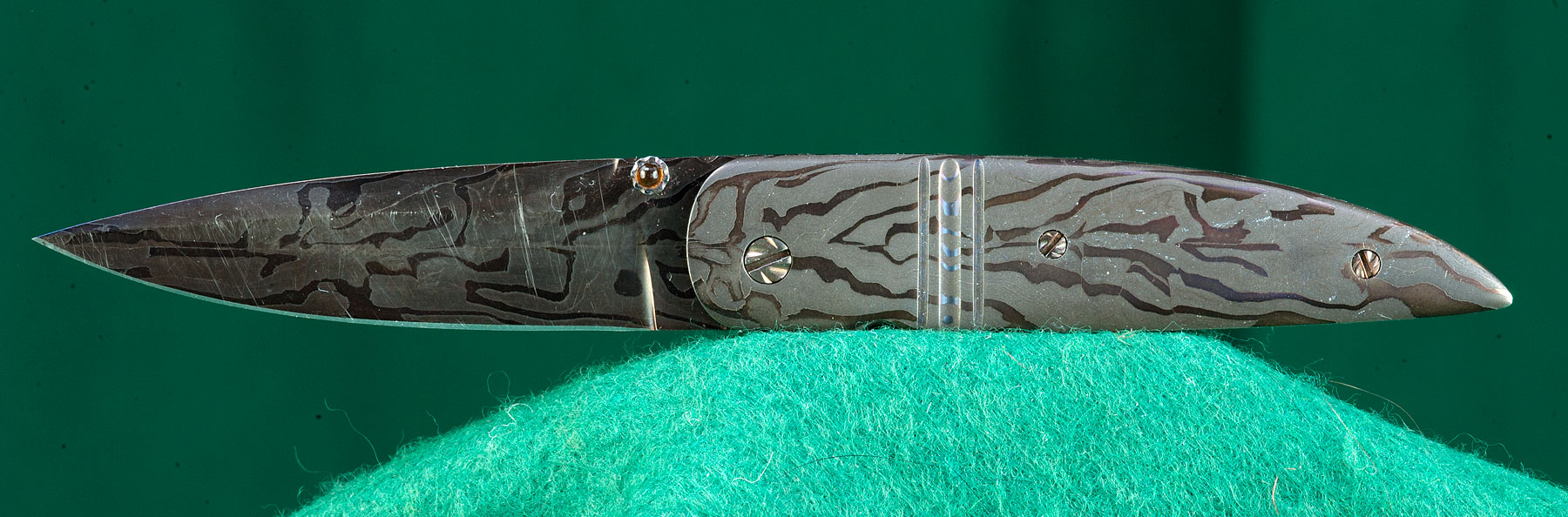 2 3/4" damascus blade with cabochon opening tab. Damascus scales. File cut back to mainspring |