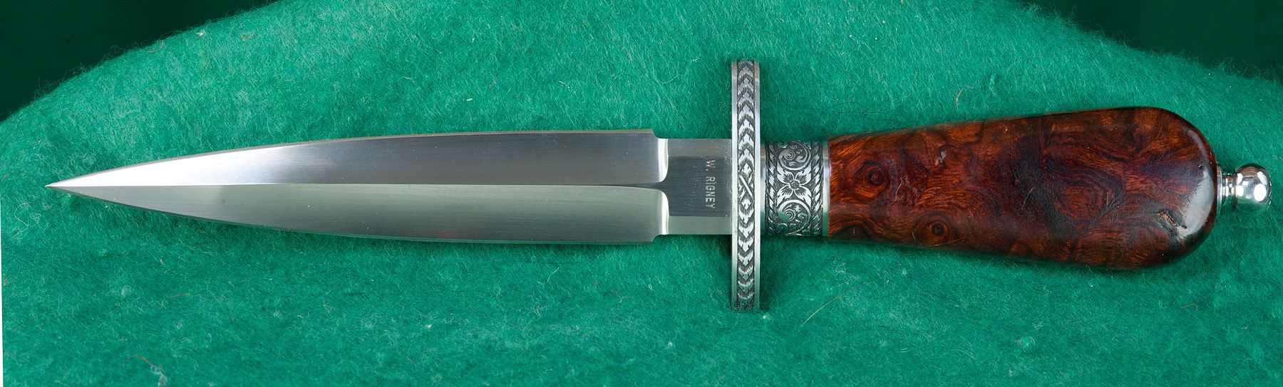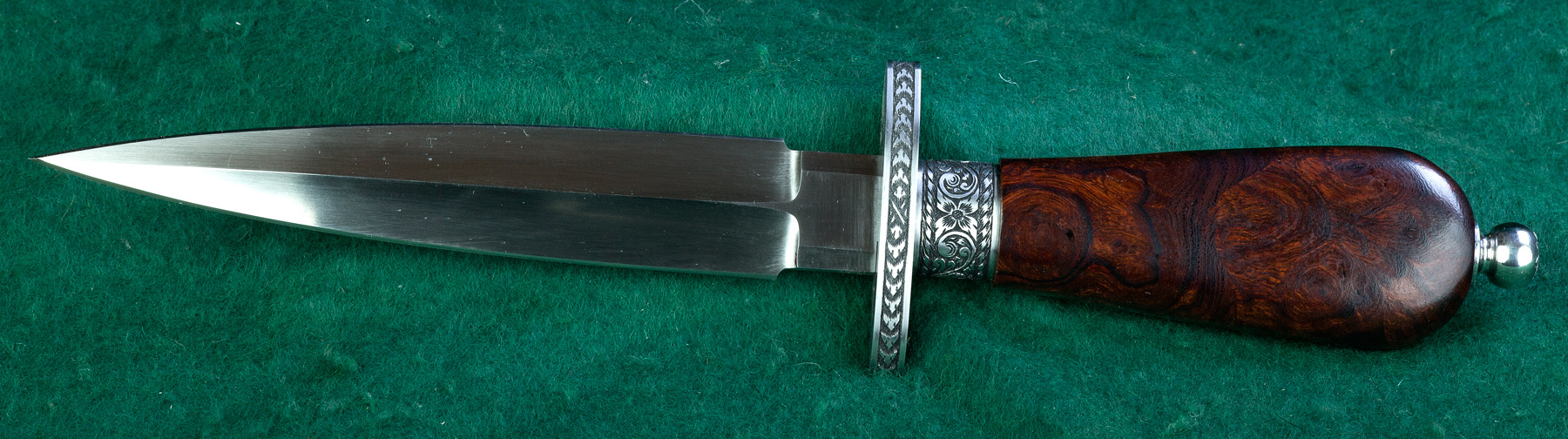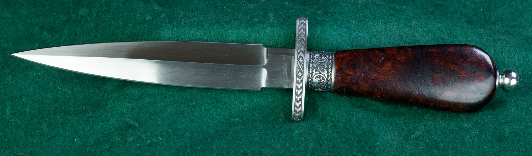 5 7/8" double-edged blade of polished steel. Smooth one-piece grip of dark, burled walnut. |
