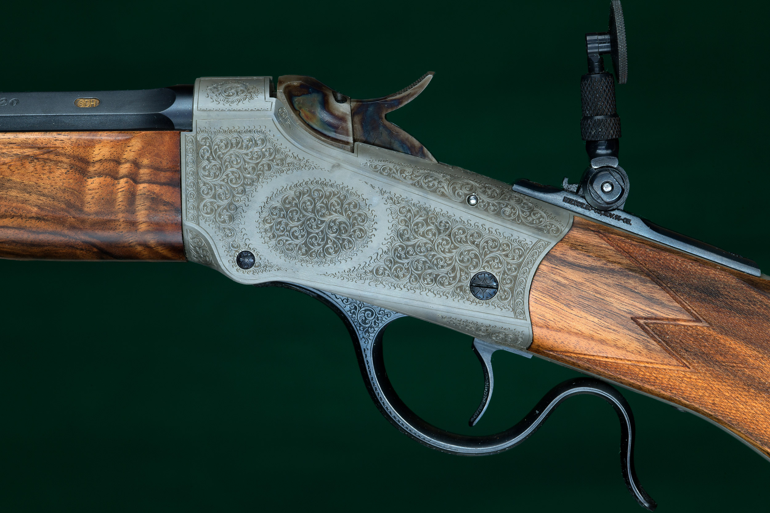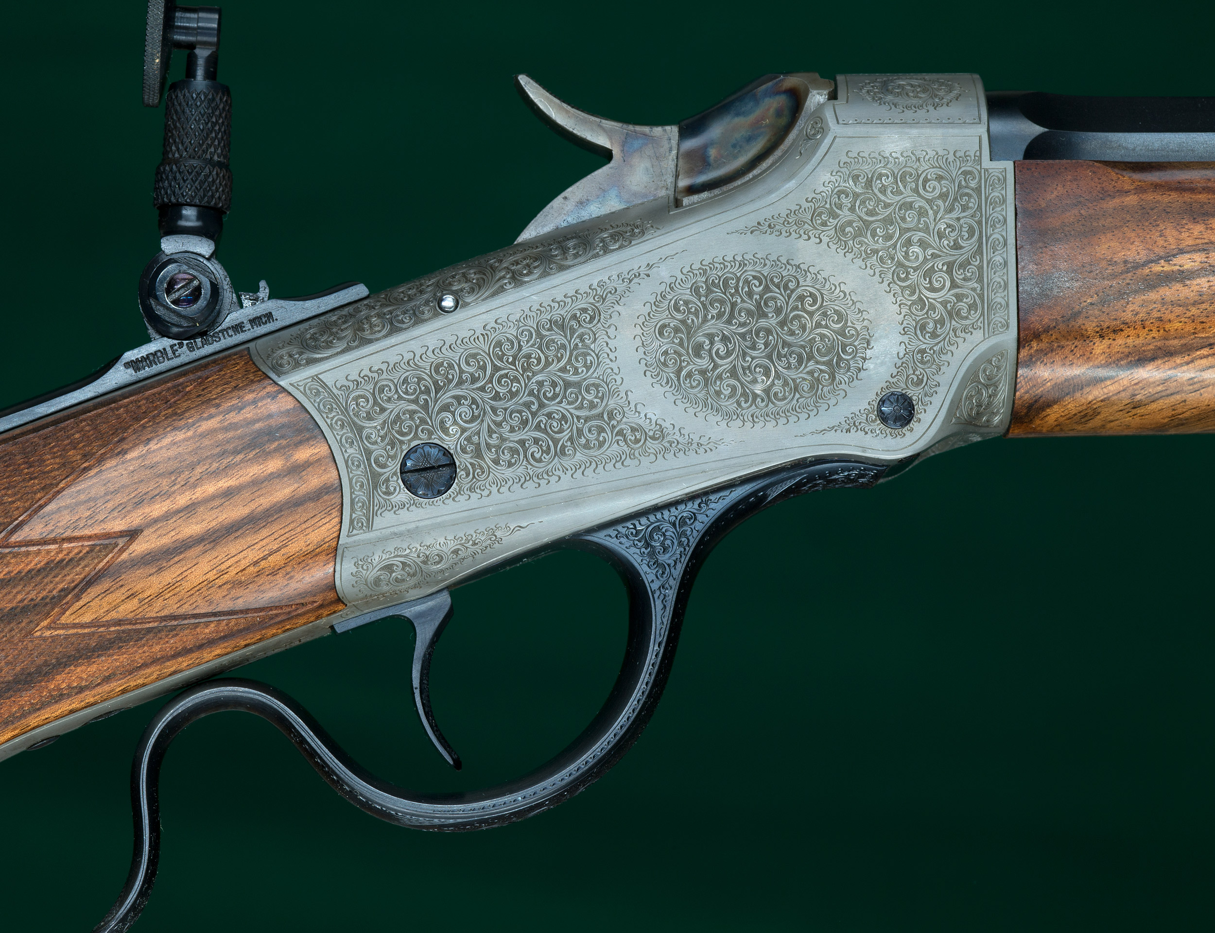 | | screws, and Marble tang peep sight. Finely scroll engraved by Michael |
