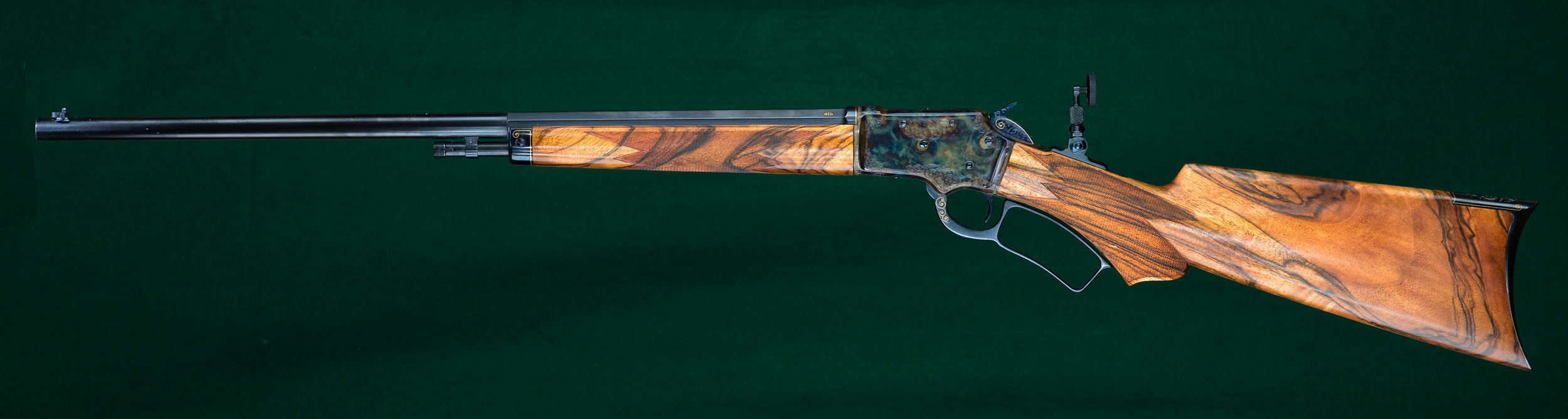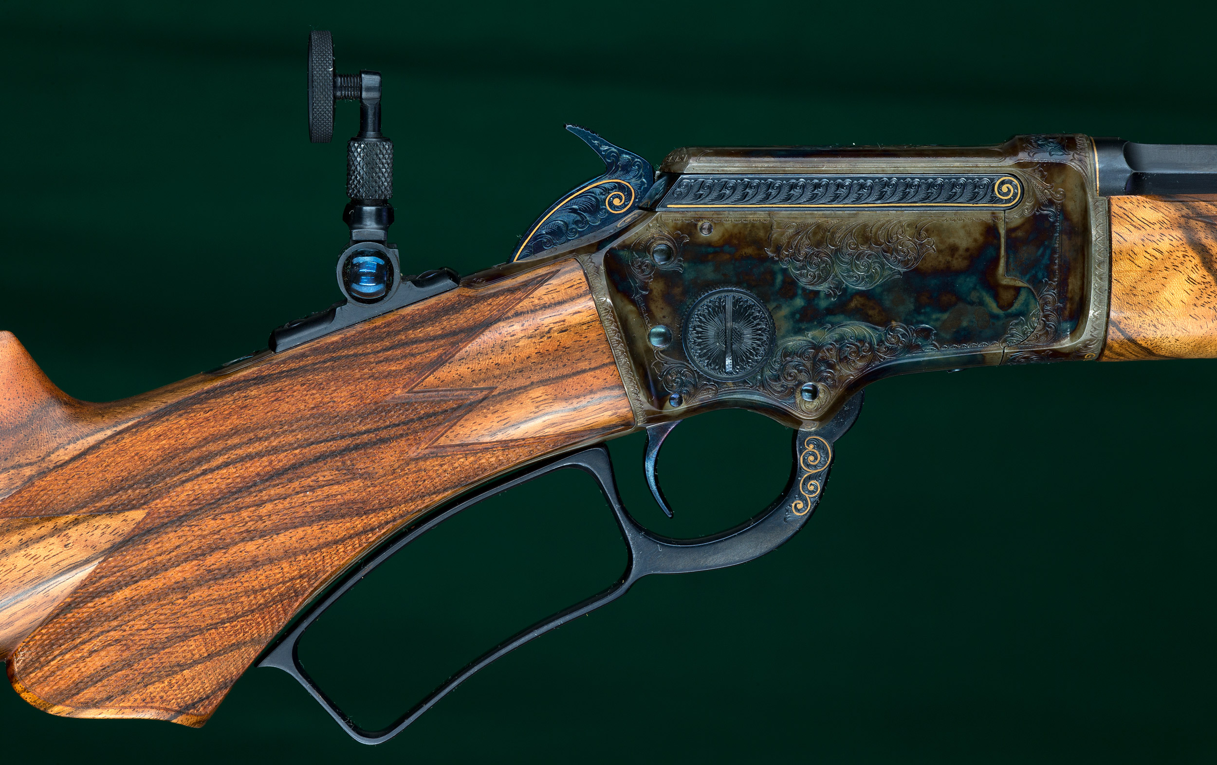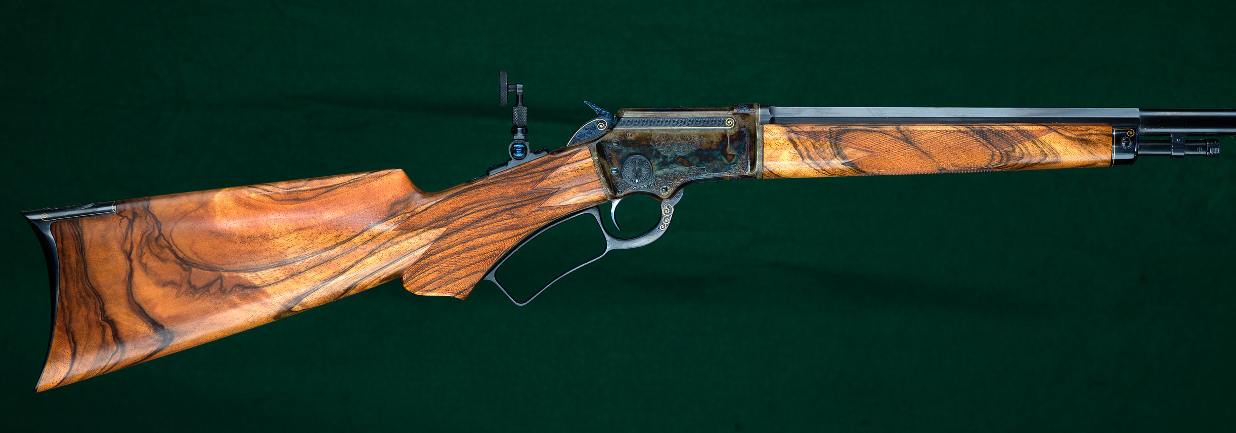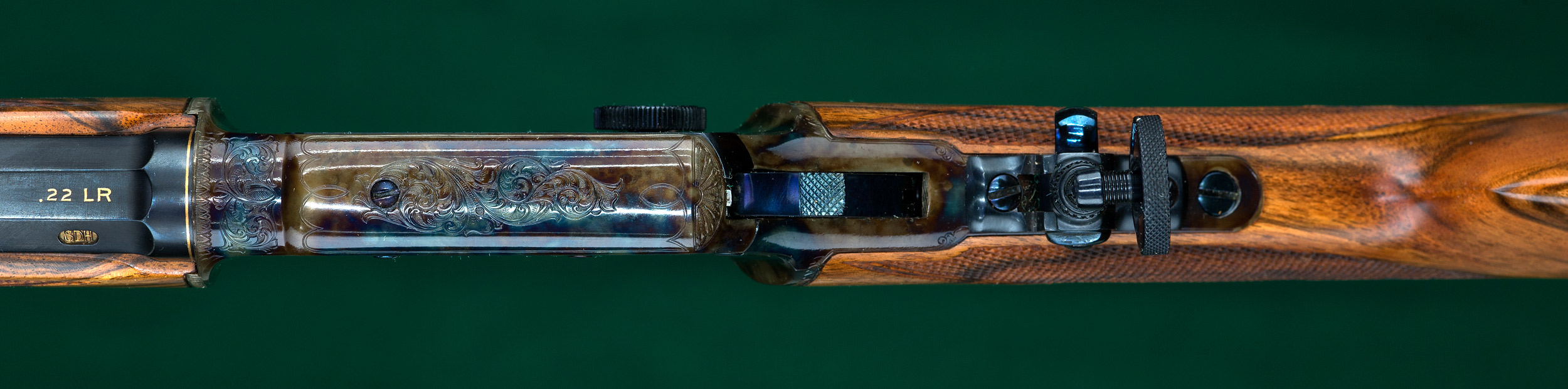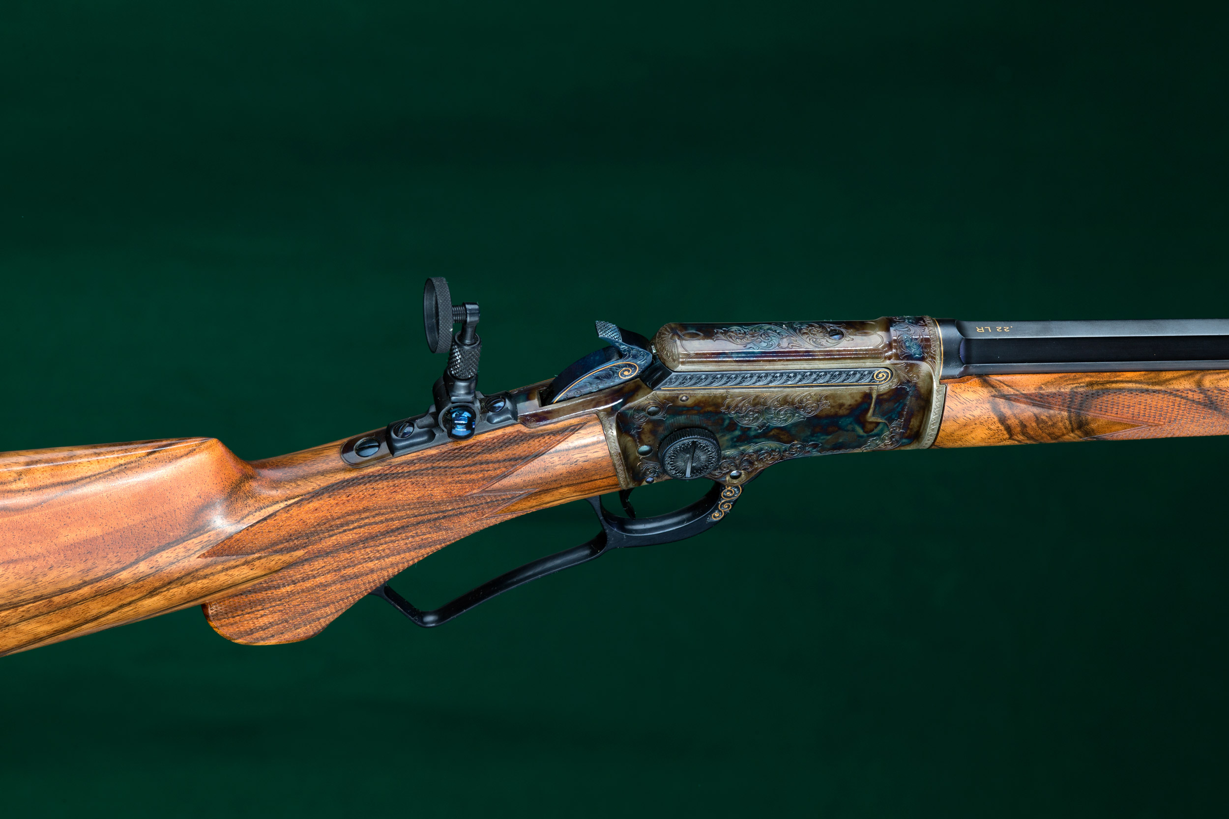 | | fire-blued hammer, oversized takedown knob and Lyman No.1A tang peep |