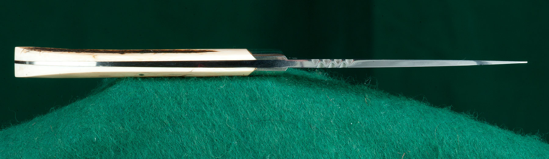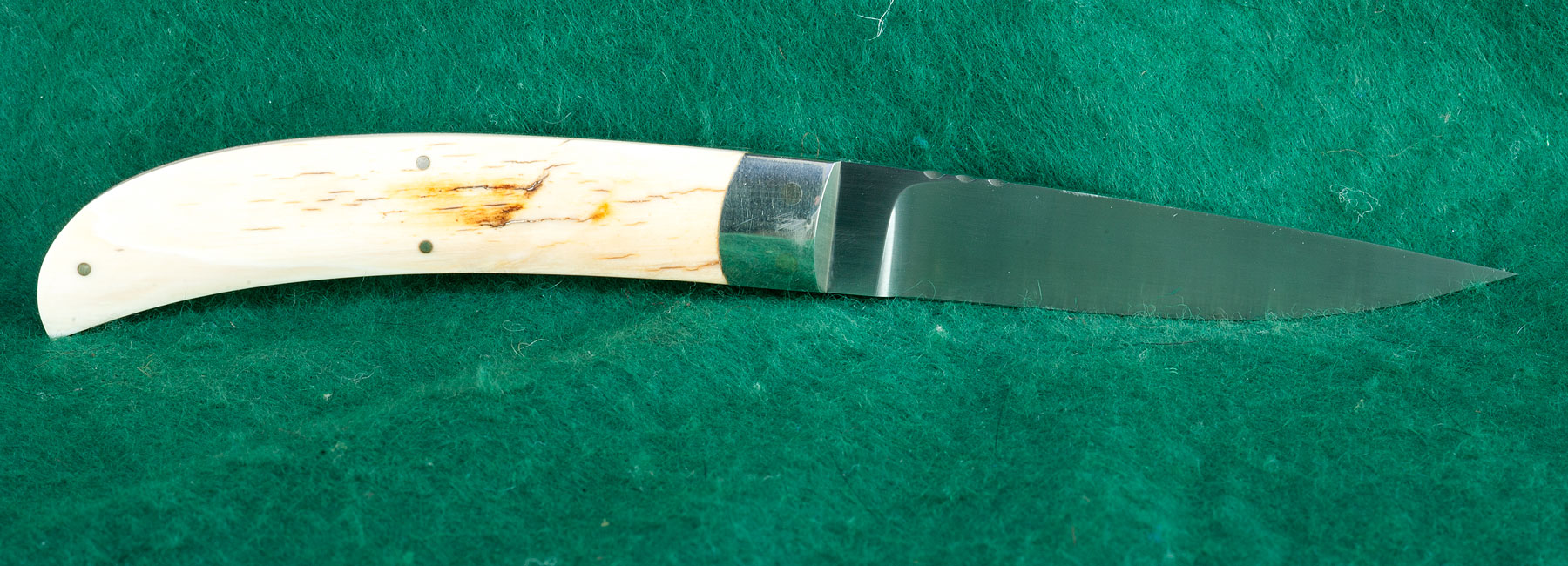 | 3 1/4" blade with lightly file-worked spine. Tapered tang. Stag scales. Overall length: 7 1/4". |