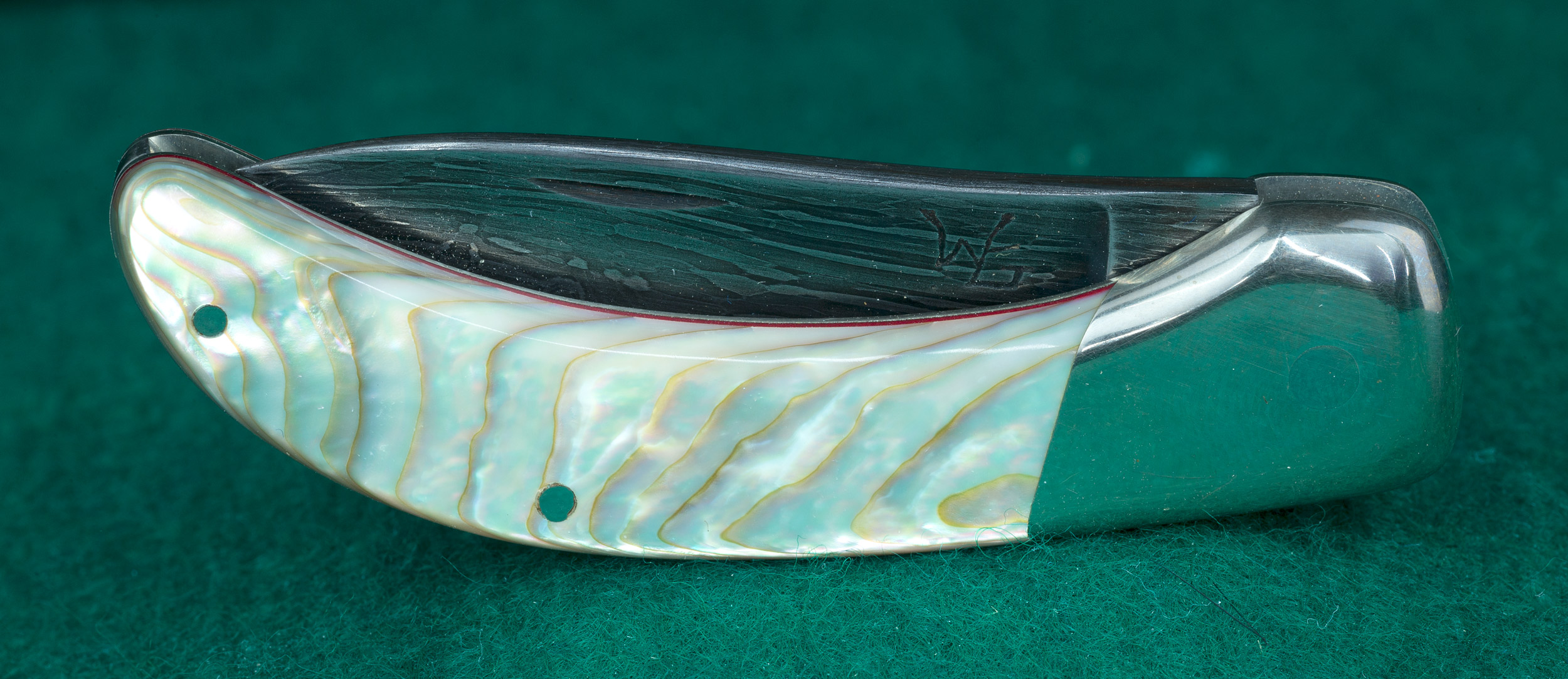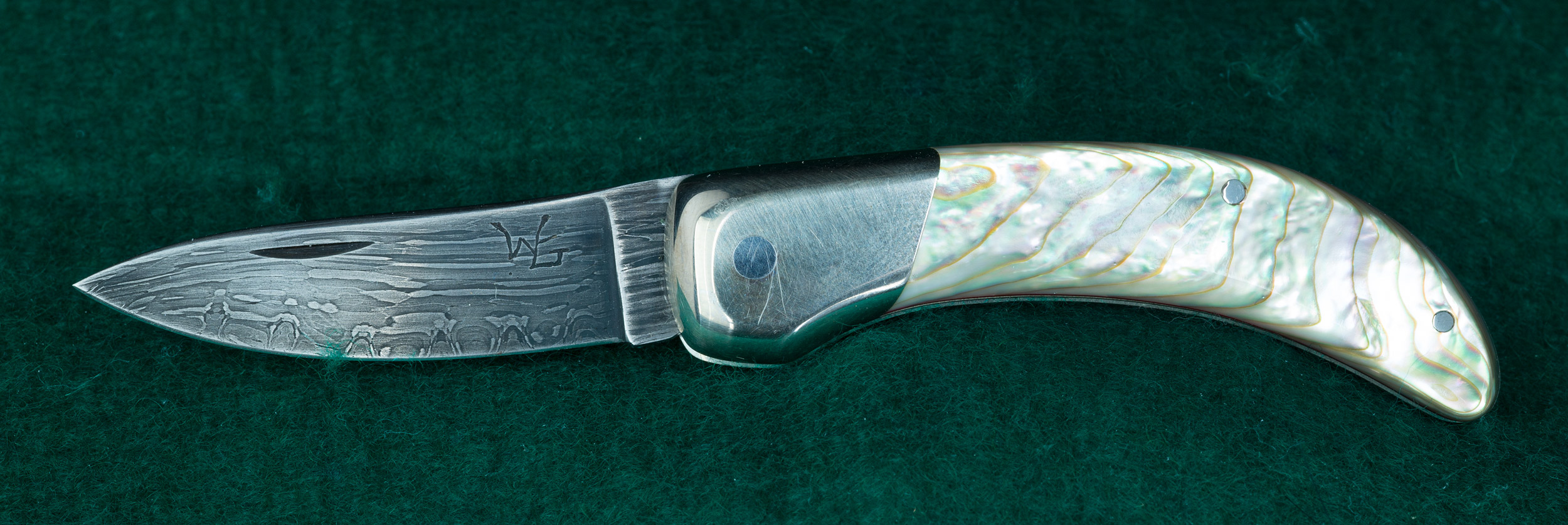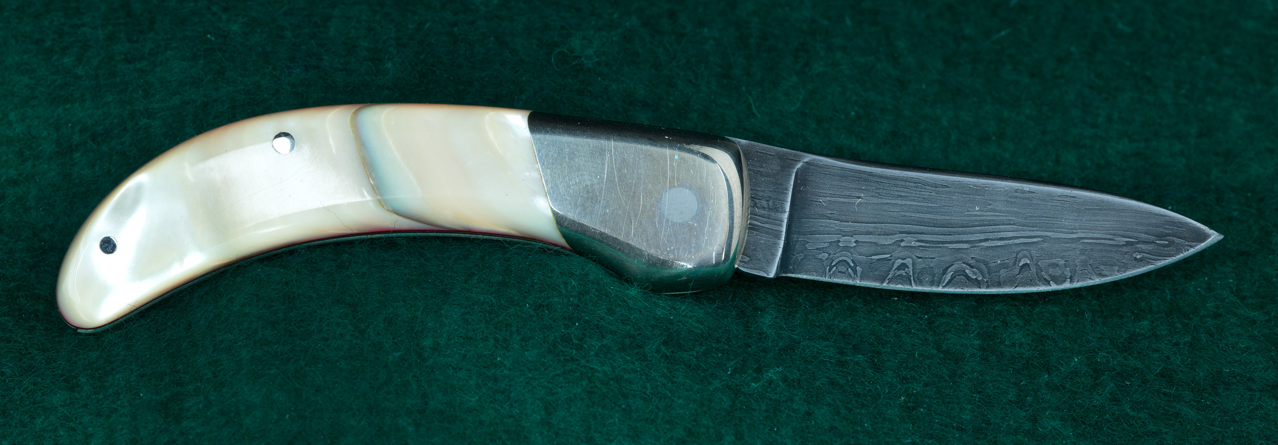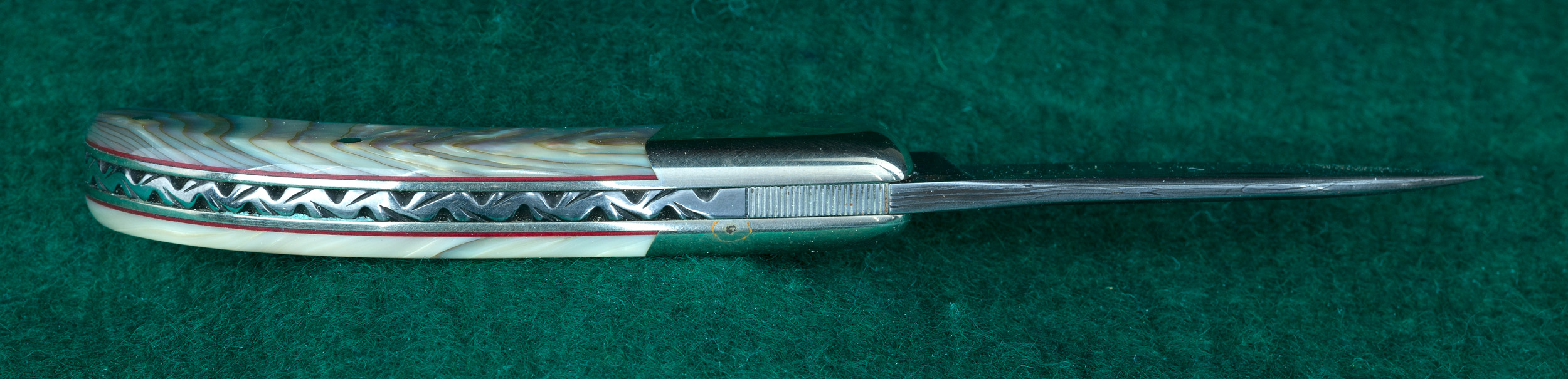 | 2" damascus blade. Nickel-silver frame and bolsters. File-cut mainspring back. Abalone scales. |