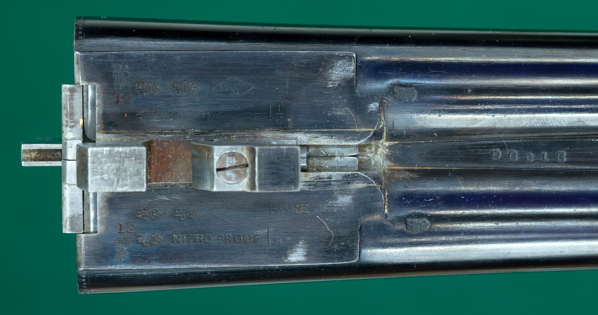 | oval. Light scroll and border-engraved action with bushed firing pins, rib- |