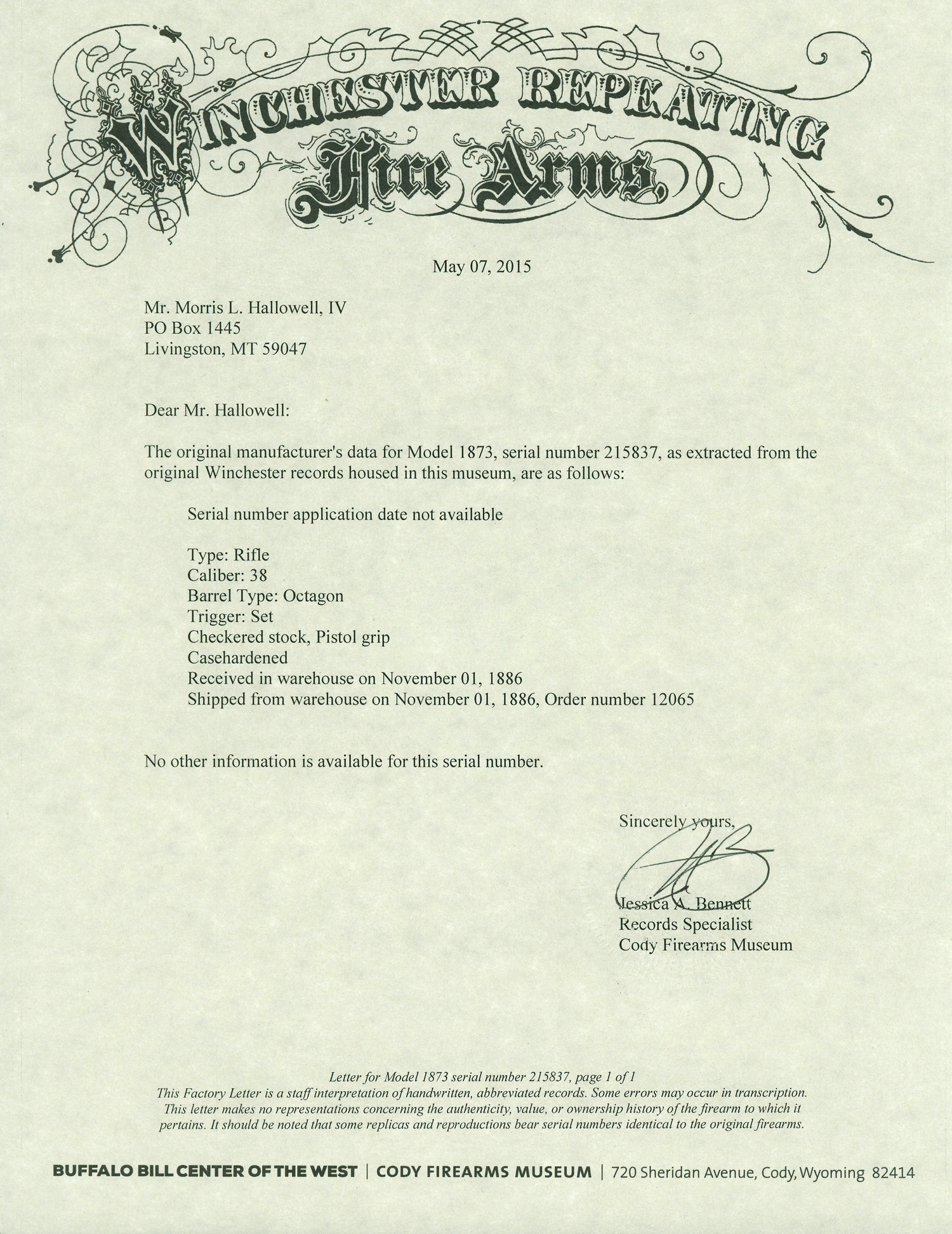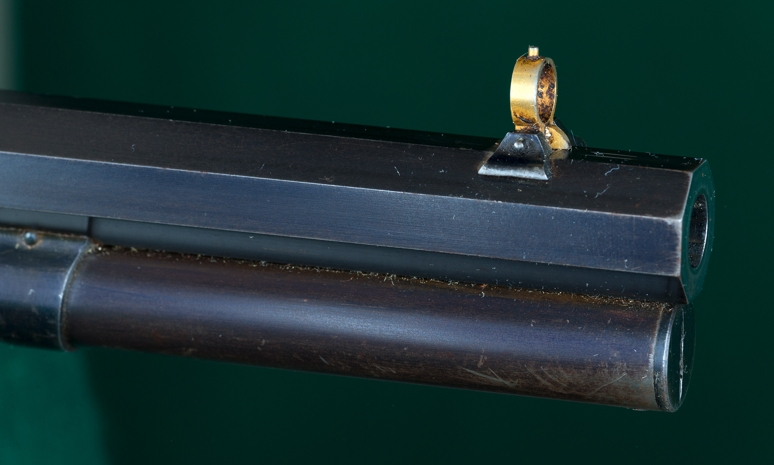 24" full octagon barrel with Beech combination front sight and buckhorn rear sight. Full magazine. Casehardened receiver, lever, hammer buttplate and forend cap. Single-set trigger. Graduated tang peep sight. Highly figured, H-Checkered walnut stocks with S-curved pistol grip with ebony inlay and trapdoor crescent buttplate containing 5-piece steel cleaning rod. Mfd 1886. 98% barrel blue, 95% magazine blue, 90% receiver case colors. Excellent bore.
