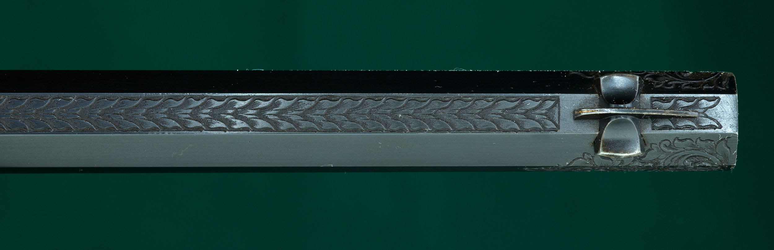 | | tree on right. Floral scroll matting full length of barrel top facet and at heel |