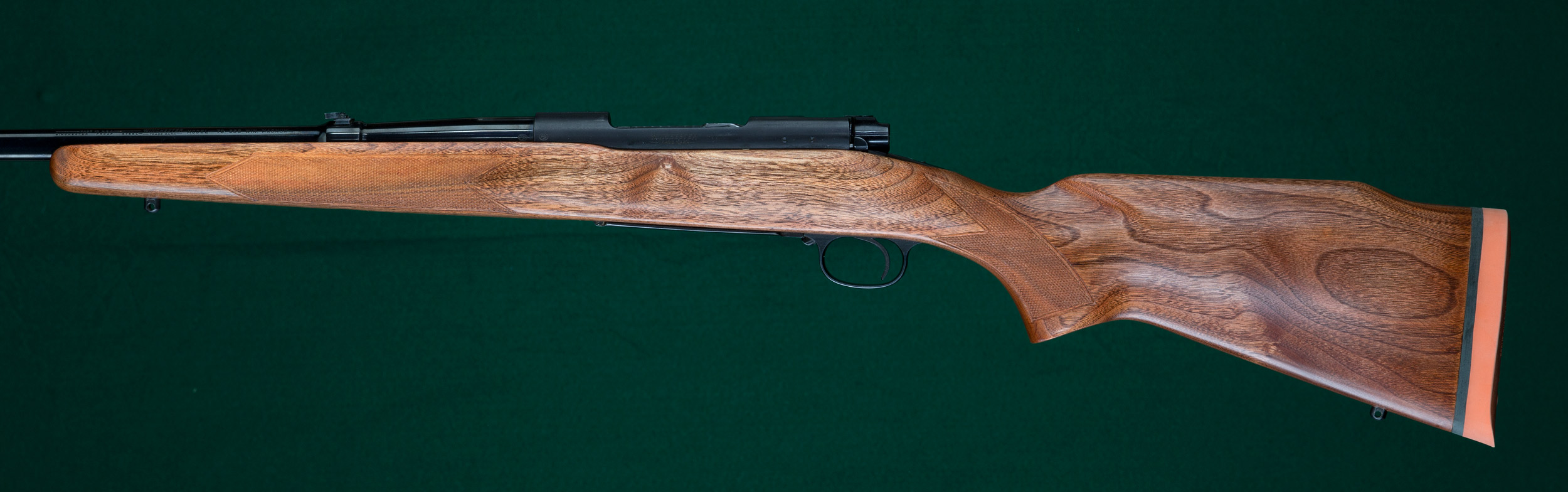 | stock with classic point-pattern checkering, swivel studs and Winchester |